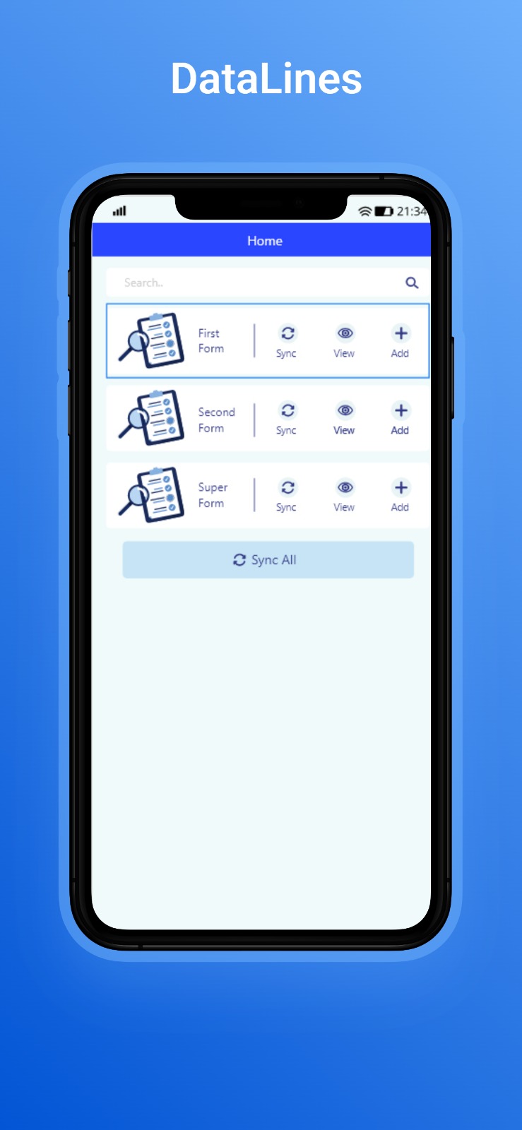 "DataLines," an application designed to enhance data collection processes. The app allows users to view customized forms with unique validation rules and designs fetched from an API. These forms are then used to collect data offline, storing these submissions in a local database. When an internet connection is available, the data can be synchronized in parallel with the server.